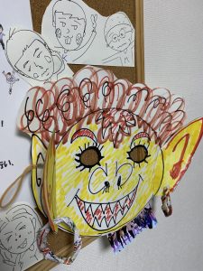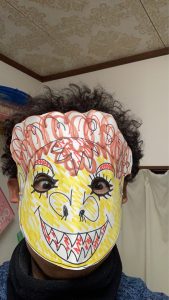 「それなら、おぐら画伯が鬼の面を手作りします!」っと子ども達が夕飯を食べている間に、鬼の面作りに取り掛かる。リアリティに欠ける・・・ダメだ。立体感がない耳を出そう・・・怖さの演出がない耳にピアスを付けよう!製作時間20分程で完成したのがこれ!!